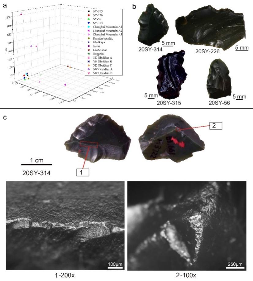 Fig. 3 Long-distance transferred obsidian. a) scatterplot of Rb, Sr, and Zr measurements for the Shiyu obsidian artefacts and obsidian sources across East Asia; b) the four obsidian lithics from Shiyu; c) SY20-314 endscraper on obsidian. 1–2, transport wear observed at 200x and 100x magnification. (Image by IVPP)