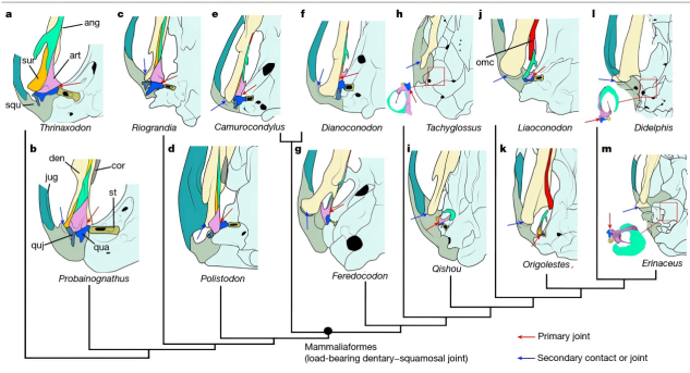 During the course of evolution, the mammalian cranio-mandibular secondary joint—formed by the dentary condyle and the squamosal glenoid fossa, which replaced the reptilian articular–quadrate joint—represents an innovative structure in vertebrate evolution. By CT-scanning two classic fossils, Chinese researchers found previously unknown jaw joints and proposed a clear, four-step sequence showing how chewing and hearing functions were gradually split between jaw and ear.