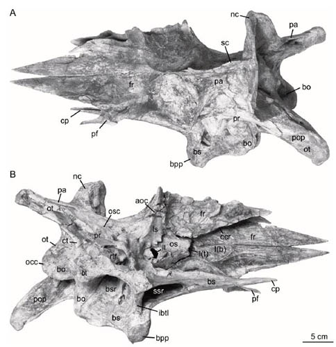 Fig.1. Dorsal (A) and ventral (B) views of the articulated braincase of