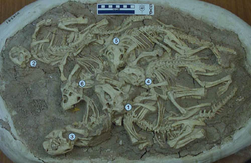 Psittacosaurus lujiatunensis (IVPP V14341) from the Lower Cretaceous of China. Bone histology indicates that specimens 2–6 were 2 years old at time of death, whereas specimen 1 was 3 years old. (Image by IVPP)