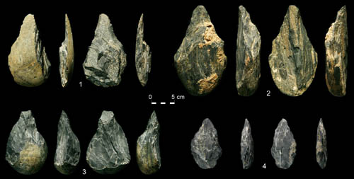 Fig. 2. Handaxes from the Danjiangkou Reservoir Region of central China: 1. handaxe made on an igneous flake with short chisel-end distal; 2. handaxe made on a bipolar flake in trachyte with thin distal; 3. handaxe made on an igneous cobble; 4. handaxe made on a corner-struck flake in trachyte. (Image by LI Chaorong)