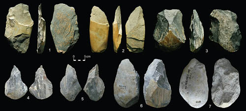 Fig. 4. Cleavers, picks and unifacial cobble picks from the Danjiangkou Reservoir Region of central China: 1. cleaver made on an end-struck flake in trachyte; 2. cleaver made on a trachyte flake; 3. cleaver made on a natural split quartz phyllite cobble; 4. pick made on a split quartz phyllite cobble; 5. pick made on a quartz phyllite cobble; 6. unifacial cobble pick made on a quartz phyllite cobble; 7. unifacial cobble pick made on a trachyte cobble. (Image by LI Chaorong)