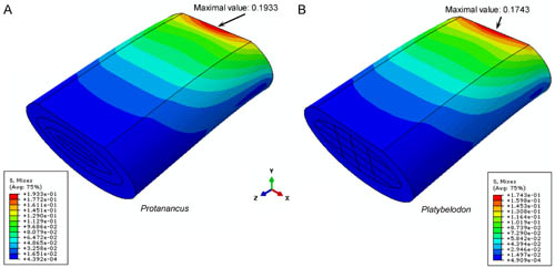 Fig. 3, Finite element models of lower tusks of Protanancus (A) and Platybelodon (B). (Image by WANG Shiqi)