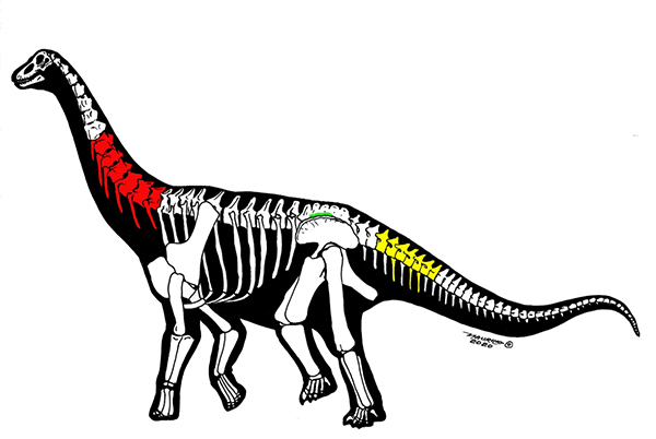 Cervical vertebrae in red: Silutitan sinensis; caudal vertebrae in yellow: Hamititan xinjiangensis; sacral vertebrae in green: unnamed specimen (Image by Maurilio Oliveira)