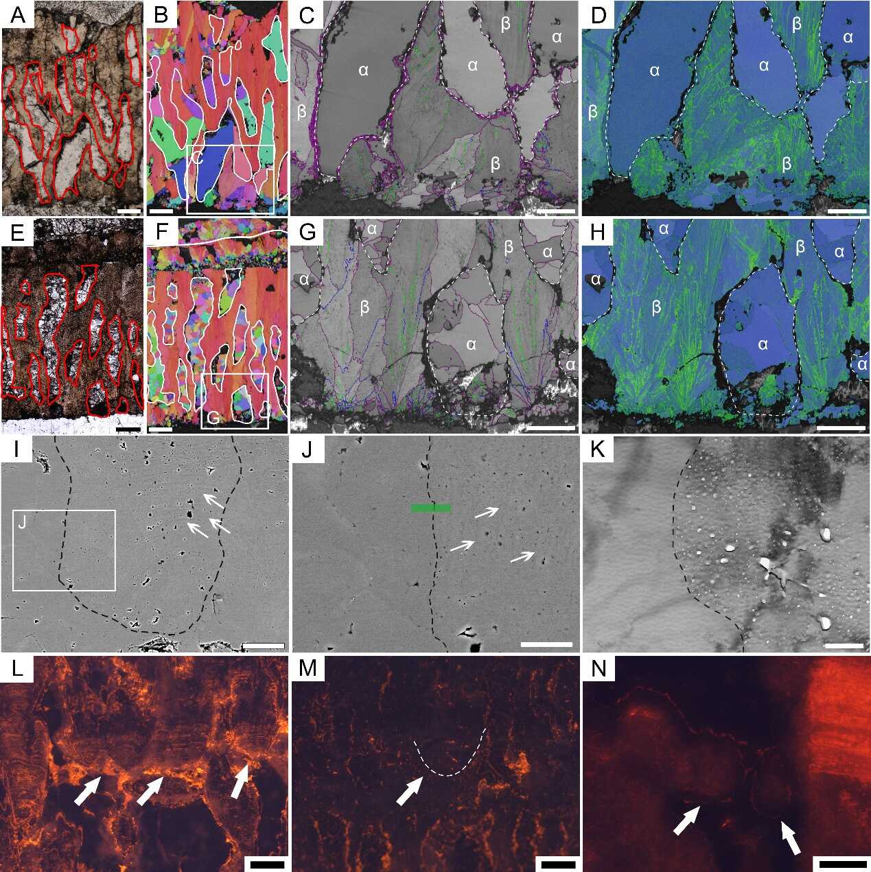 The differences between the biogenic and abiogenic calcite in dinosaur eggshells: In the PLM images (A and E), biogenic calcite is dark, while abiogenic calcite is bright; On the IPF maps (B and F), the directions of the c-axes of the biogenic calcite grains are consistent (red), while various in the abiogenic calcite grains (various colors); On the BC+GB maps (C and G), biogenic calcite has textured gray scales, while abiogenic calcite has plain gray colors; On the KAM maps (D and H) , biogenic calcite has high KAM values (green), while abiogenic calcite has low KAM values (blue). SEM (I and J) and TEM (K) images show that biogenic calcite has growth lines (arrows) and porous structure. In the CL images (L—N), SEUs are dark or have orange fluorescence, indicating that CL is not an effective method for the identification of biogenic calcite. Scale bars are equal to 200 μm (A, B, E, and F), 100 μm (C, D, G, H, and N), 50 μm (I),15 μm (J), 500 nm (K), and 150 μm (L and M).