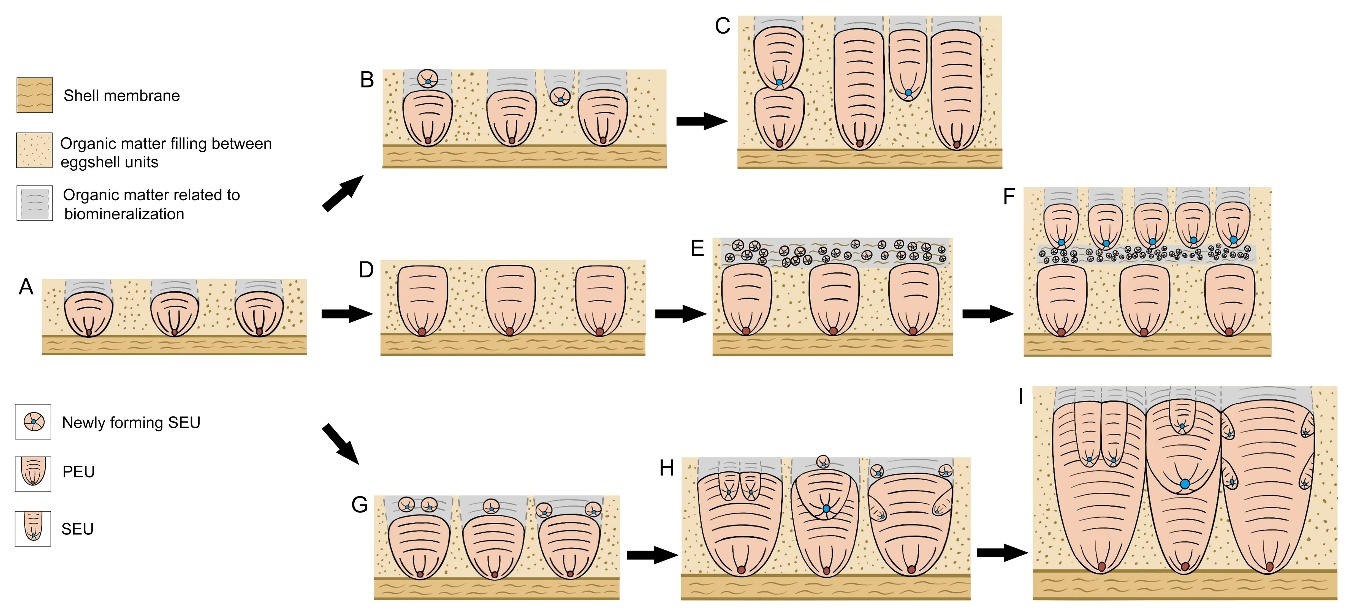 Formation mechanism of dinosaur eggshells containing SEUs. B—F: Highly porous eggshells, SEUs are superimposed on PEUs, inside pore canals (B and C), and form layers (E and F);G—I: Moderately porous eggshells. SEUs are mostly embedded in PEUs and other SEUs.