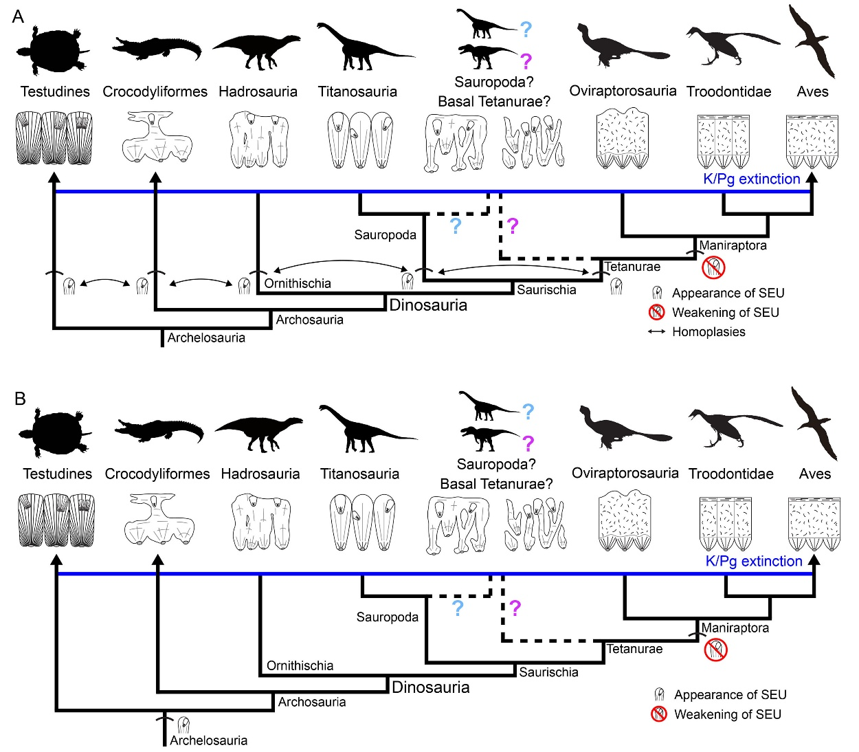SEUs gradually decline in the maniraptoran eggshells. The SEUs of turtle, crocodilian, ornithischian dinosaurs, sauropod dinosaurs, and theropod dinosaurs might result from parallel evolution (A), or might have a deep homology (B).