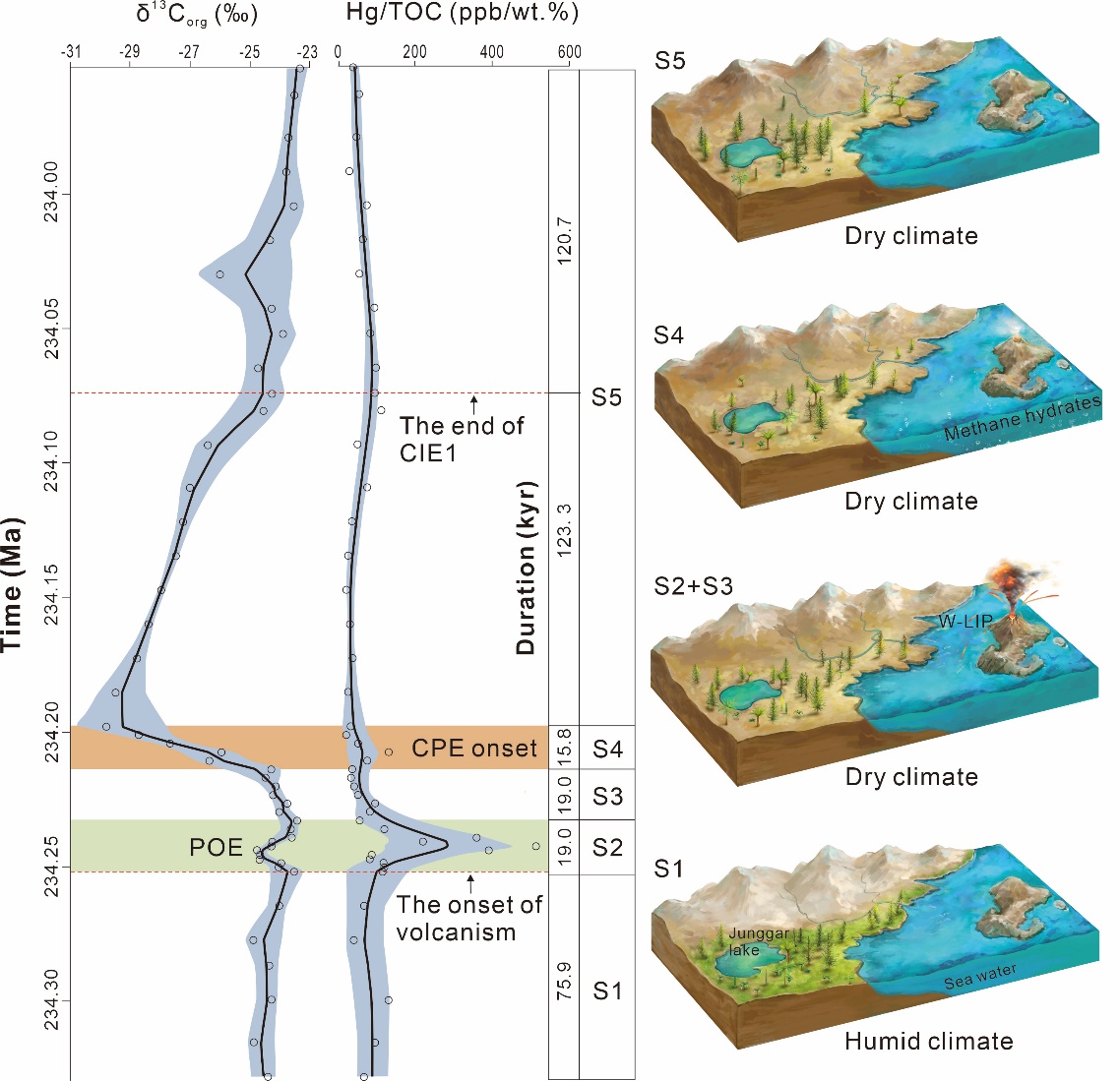 The Mesozoic Era was marked by long-term greenhouse climates and repeated hyperthermal events—periods of rapid global warming—that profoundly affected life, ecosystems, and petroleum systems. The Carnian Pluvial Episode (CPE, ~234–232 Ma), is characterized by global warming, intensified hydrological cycling, increased continental weathering and erosion, and expanded marine anoxia. Popularized as a “million‑year global rain” (Marshall 2019, Nature), and often linked to dinosaur emergence, the CPE’s trigger mechanisms and climate feedback patterns have long remained controversial.