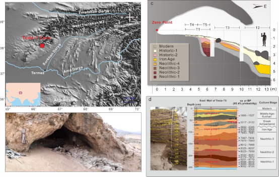 Located in the heart of Eurasia, Central Asia connects East and West Asia, as well as South and North Asia, serving as a crossroads for ancient human and cultural exchanges. Research on the origins of early agriculture and pastoralism in this region has long been scarce, making it a "missing link" in the story of agricultural origins and dispersal. In recent years, the joint research team conducted field surveys in the piedmont regions of southern Uzbekistan, discovered Toda-1 Cave, and after three excavation seasons (2017–2019), uncovered cultural layers from the early Neolithic period.